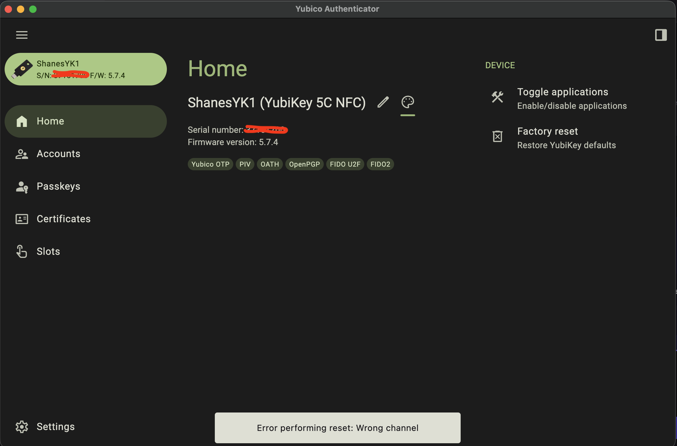 I then popped over the Yubikeys support site, entered a support request, sent them my notes, included this screen shot and am waiting to hear back as to why this failed. I mean, factory reset means wipe the device and start over. But, apparently, when you select FIDO2, it fails.
