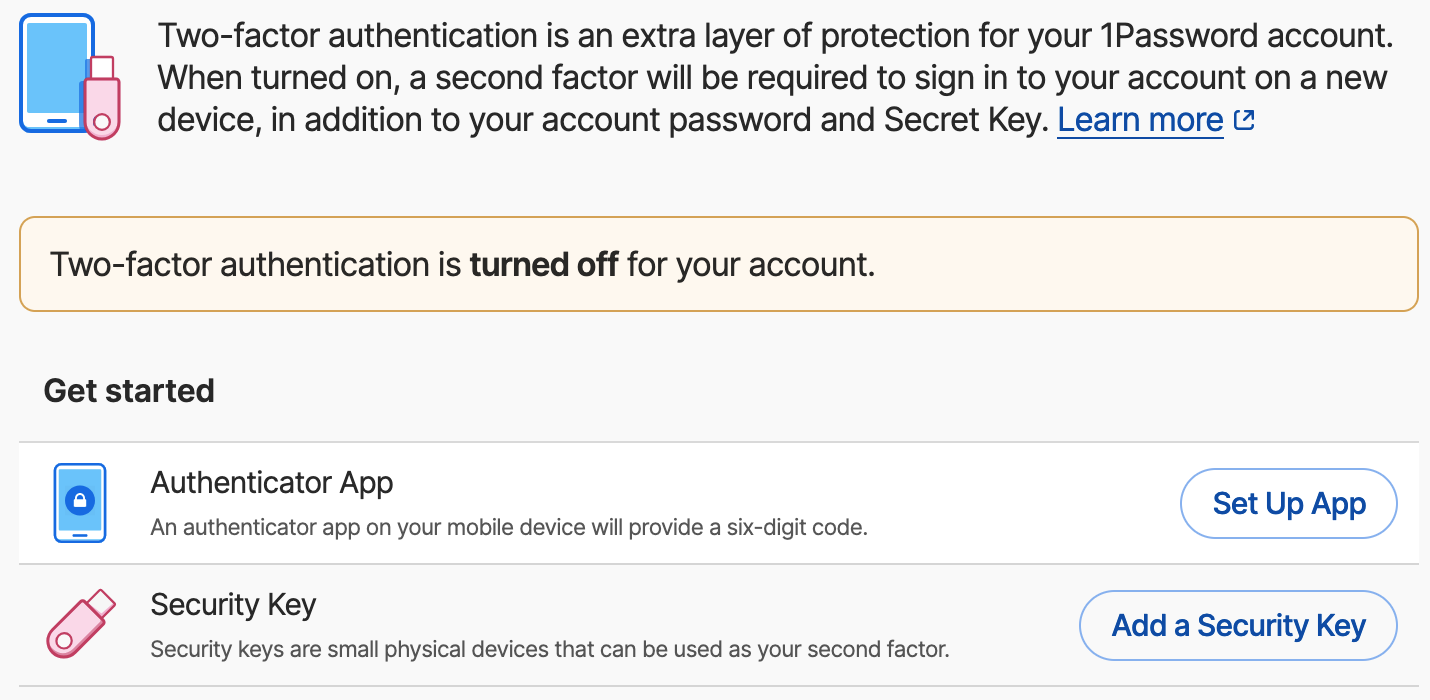 To get started, I pulled up the 1Password documentation and quickly read through to get the general gist. Enable 2FA using a Security Key or Hardware Token, say yes to a few prompts and voila'.