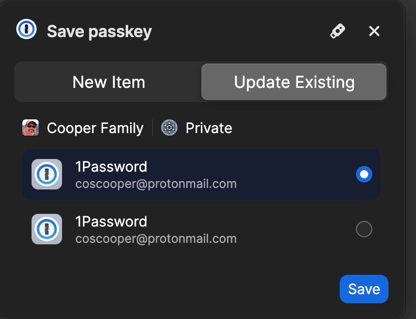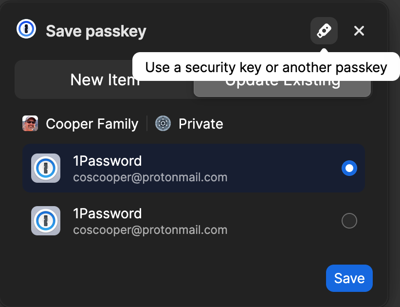 So - moving along, I hit save to the Passkey - which basically saved it back into 1Password - weird. (I actually failed at this point - because the documentation clearly said click on the little USB icon on the top right, NOT hit save) - but acting like a general user, the most obvious was to just hit save. Which - I did.